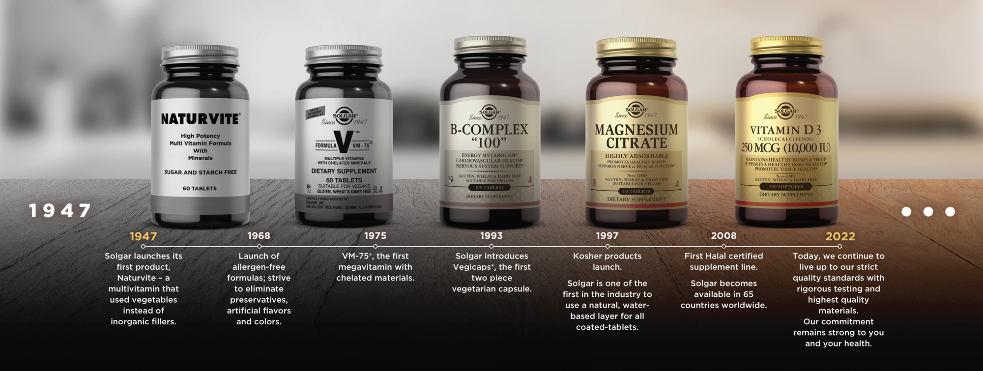 Ispod svakog zlatnog Solgar čepa nalazi se staklena bočica boje jantara koja sadrži priče o desetljećima marljivog istraživanja, znanosti i nepokolebljivoj predanosti dobrobiti.